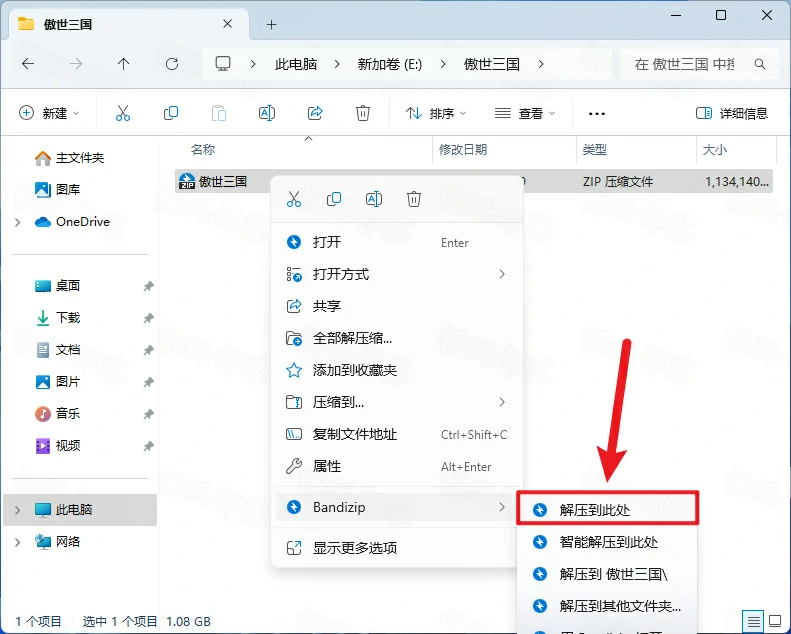 1.软件下载完成后,鼠标右击傲世三国下载程序,点击解压到此处